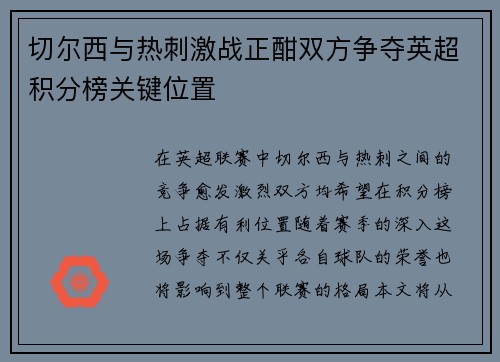 切尔西与热刺激战正酣双方争夺英超积分榜关键位置