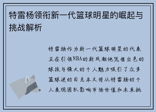 特雷杨作为新一代篮球明星的代表,正在引领NBA的新风潮。他凭借出色的球技与强大的个人魅力,吸引了众多篮球迷的目光。本文将从特雷杨的个人表现、团队影响、市场价值和未来挑战四个方面,对他在现代篮球文化中的崛起与面临的挑战进行深入解析。从他的技术特点到对球队的贡献,再到商业价值的提升以及职业生涯中可能遇到...